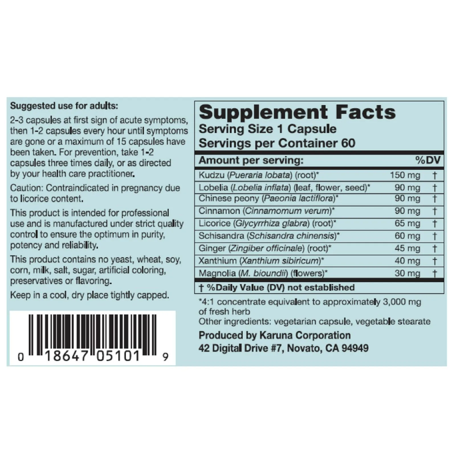- Karunas AllerEze contains no ephedrine and benefits from the addition of other herbs that enhance this uniquely effective formulation. AllerEze contains herbal extract concentrates that provide four times the activity of the raw, unconcentrated herb, requiring fewer capsules.