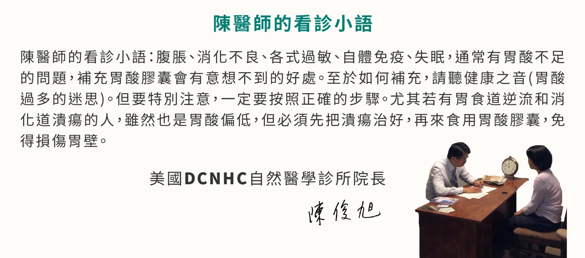 說明:消化不良可能由許多因素引起,像是胃中鹽酸(HCl)含量不足。胃中的鹽酸(HCl)分泌確實有幾個正面的作用。通過活性胃蛋白酶幫助蛋白質消化、使胃抵抗攝入的病原體、抑制小腸中生長、並且它促進膽汁和胰臟酵素的流動。