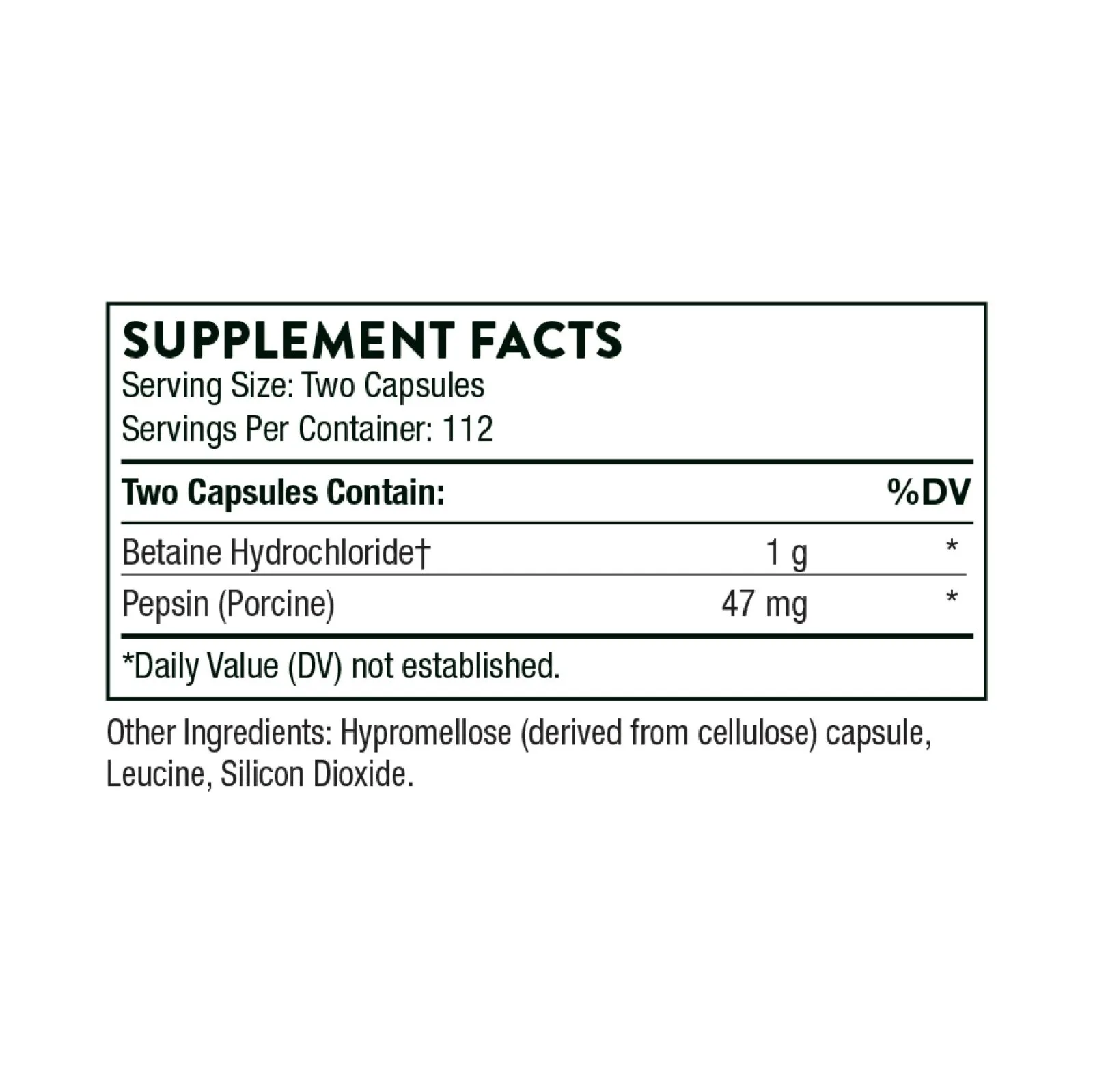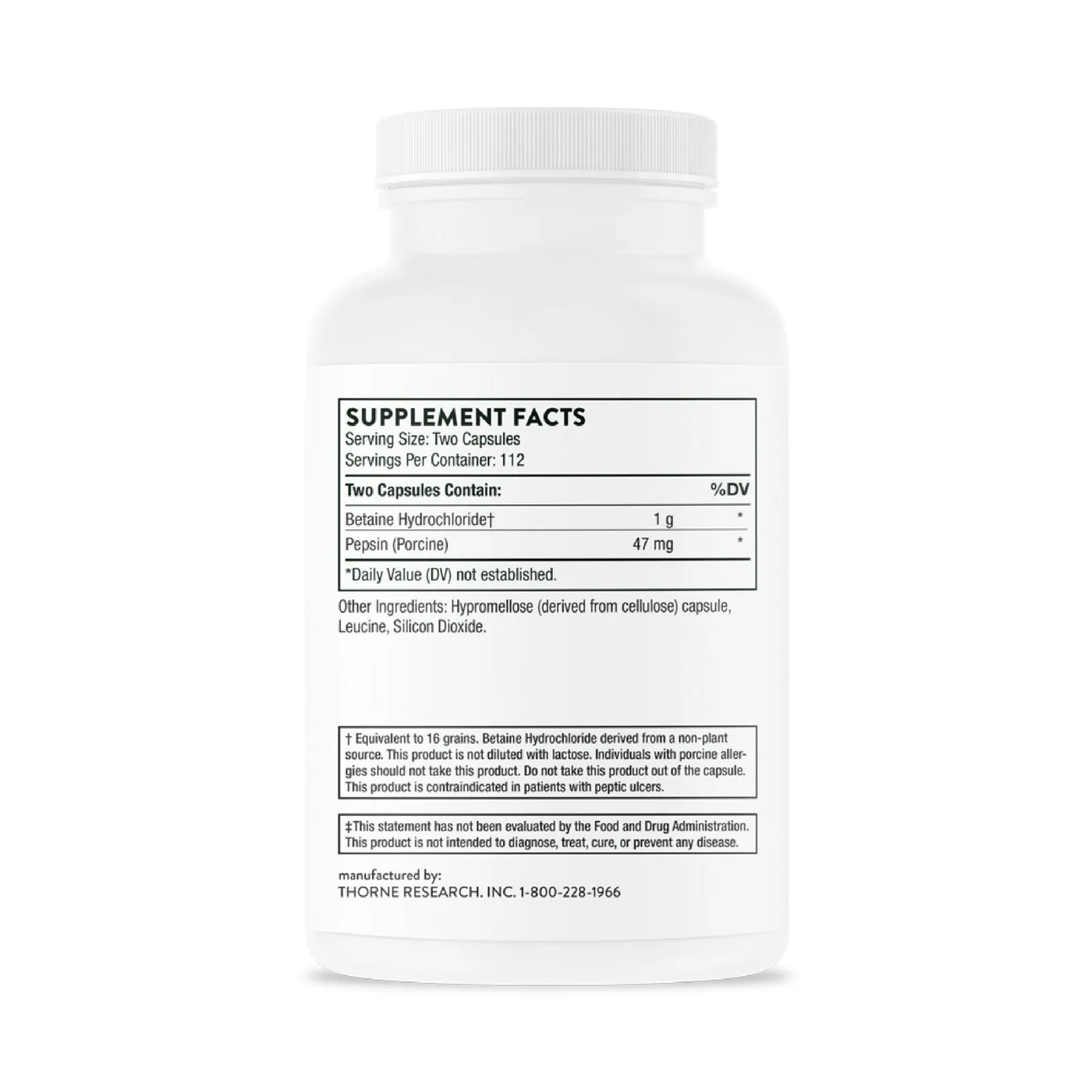 - Description:Indigestion can be caused by many things – including inadequate amounts of hydrochloric acid (HCl) in the stomach. HCl secretion in the stomach does several positive things. It assists protein digestion by activating pepsinogen to pepsin, it renders the stomach sterile against ingested pathogens, it inhibits undesirable overgrowth in the small intestine, and it encourages the flow of bile and pancreatic enzymes.* Hydrochloric acid also facilitates the absorption of a number of nutrients, including folate, vitamin B12, ascorbic acid,porcine source beta-carotene, iron, and some forms of calcium, magnesium, and zinc.* Numerous studies have shown that hydrochloric acid secretion in the stomach begins to decline with advancing age. Overuse of antacids or acid blockers can also lead to low levels of hydrochloric acid in the stomach, which can result in poor protein digestion.* Thorne’s Betaine HCl & Pepsin comes from a porcine source.