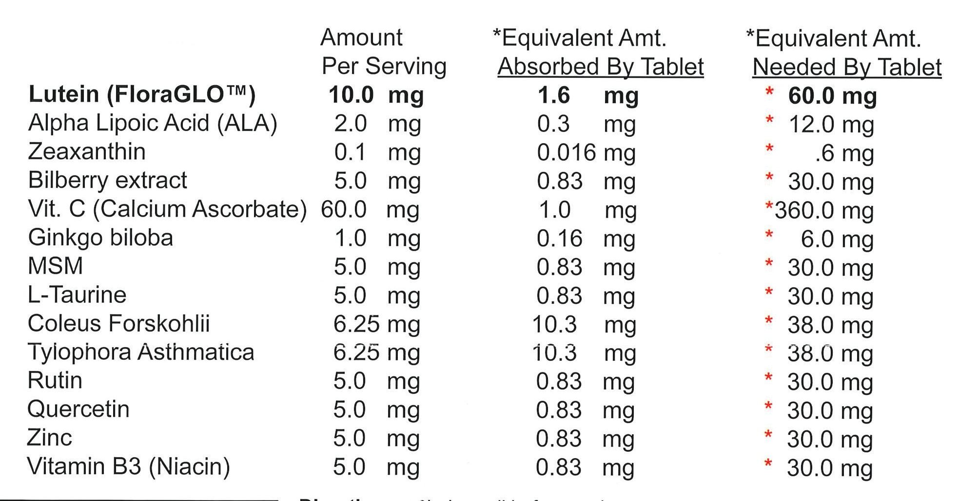 主要成分:維生素c、葉黃素、鞘蕊花屬、黃藤莖、山桑子、玉米黃質、硫辛酸、芸香素、槲黃素、銀杏